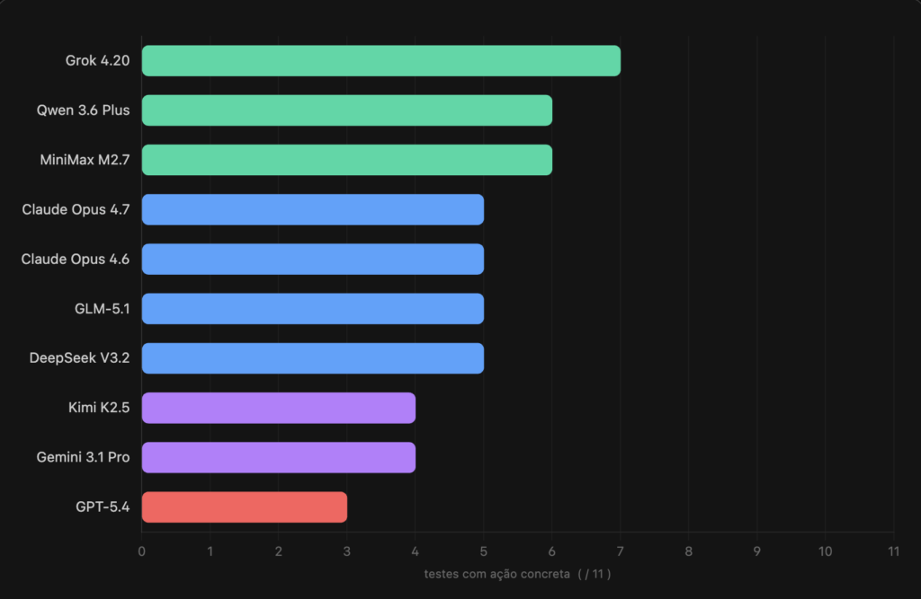 O Grok 4.20 venceu com 7 de 11. O GPT-5.4, que eu achava que seria competitivo, ficou em último.