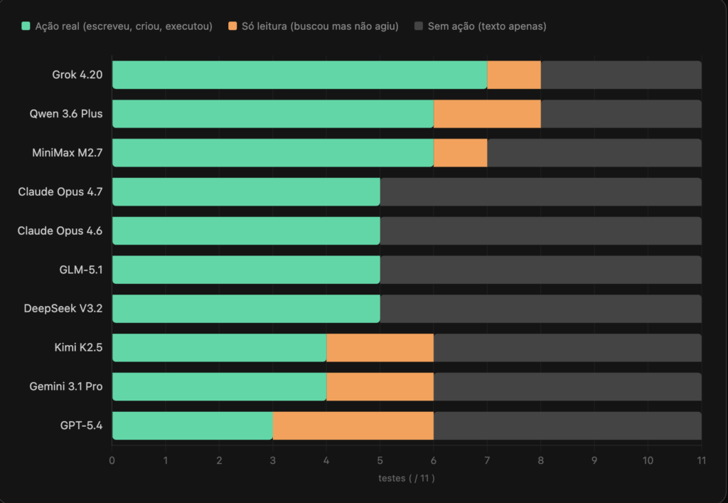 Decomposição de cada modelo nos 11 testes: executou até o fim, só leu sem agir, ou nem isso. Verde é o único sinal bom.