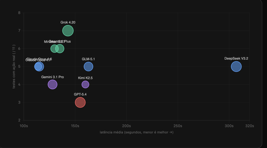 Sobre o Claude Opus 4.7 (meu modelo preferido): ficou no meio. Latência ótima (mais rápido do grupo), respostas concisas, mas só 5 de 11 testes com ação concreta. Consistente com a sensação que eu já tinha do uso diário: ele é “educado” e meio preguiçoso. Prefere descrever o que faria.
