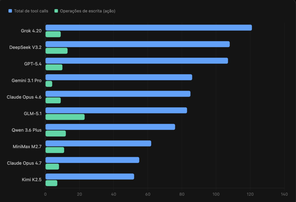 GPT-5.4 fez 107 tool calls e só 10 viraram ação (9% de taxa de conversão). GLM-5.1 é o oposto: 83 tool calls geraram 23 escritas (28% — o mais granular do grupo).