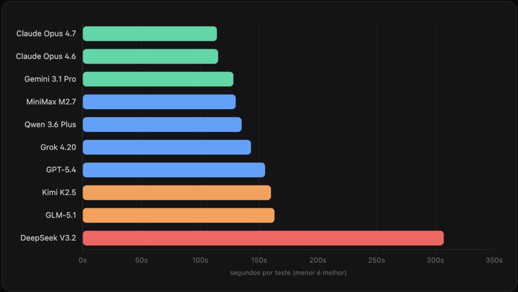Repara uma coisa interessante: não existe correlação forte entre velocidade e qualidade de execução. Os dois Opus são os mais rápidos, mas não os melhores executores. O DeepSeek V3.2 é o mais lento, mas está no meio do ranking. O Grok 4.20 é médio em velocidade e o melhor em execução.